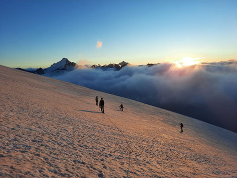 - Gletscher-Trekking in Richtung Vincentpyramide (4'215 m.ü.M) in gemütlichem Tempo (ca. 250 Höhenmeter pro Stunde) zur Akklimatisation. Rücksichtnahme auf Körpersignale